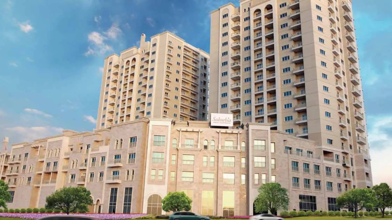Built by DAMAC Properties, Suburbia is a spectacular apartment complex comprising two towers with spacious duplexes and single floor residences. The exterior of the building is inspired by a montage of Moroccan architecture with bright colours and geometrical patterns. The duplexes combine the convenience of an apartment with the feel of a villa, featuring private terraces and beautiful landscaping.